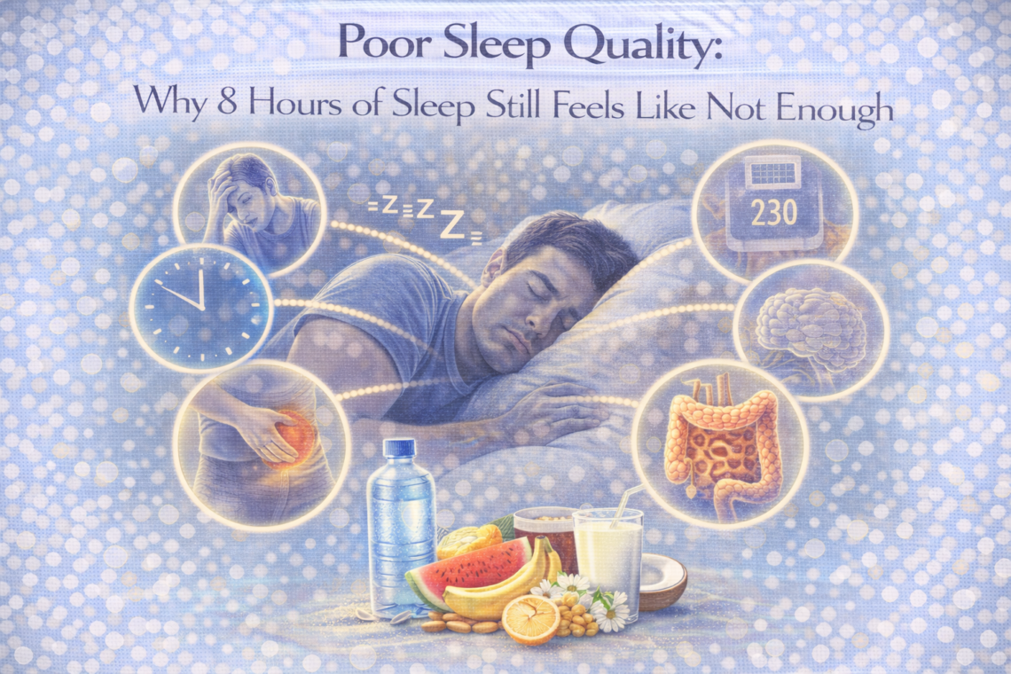 Introduction Many people sleep for 7–8 hours every night yet wake up tired, unfocused, and low on energy. The problem isn’t sleep duration—it’s sleep quality. Poor sleep quality silently affects hormones, metabolism, immunity, mental health, and productivity. What Is Poor Sleep Quality? Poor sleep quality means your body doesn’t move properly through deep and REM sleep stages. Even if you sleep long hours, your brain and body fail to fully recover. Common Signs of Poor Sleep Quality Main Causes of Poor Sleep How Poor Sleep Affects Your Health Natural Ways to Improve Sleep Quality Foods That Support Better Sleep Final…