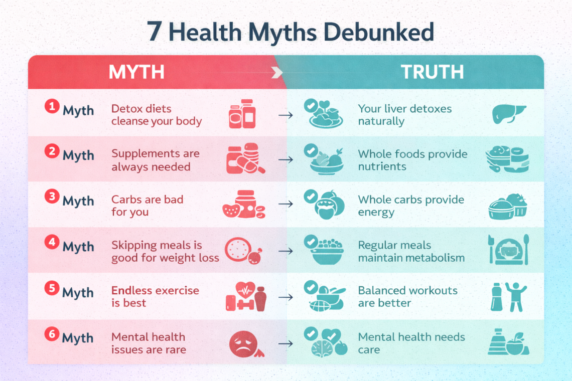 🌟 Introduction The internet is full of health advice — but not all of it is true. In 2025, many popular health beliefs are being questioned and debunked by science. Following the wrong advice can lead to poor health decisions, wasted money, and unnecessary stress. In this article, we break down 7 common health myths and replace them with facts backed by science, so you can make smarter choices for your body and mind. ❌ Myth 1: Detox Diets Cleanse Your Body Truth: Your body already has a built-in detox system — your liver and kidneys. ✅ What works instead:Eat…